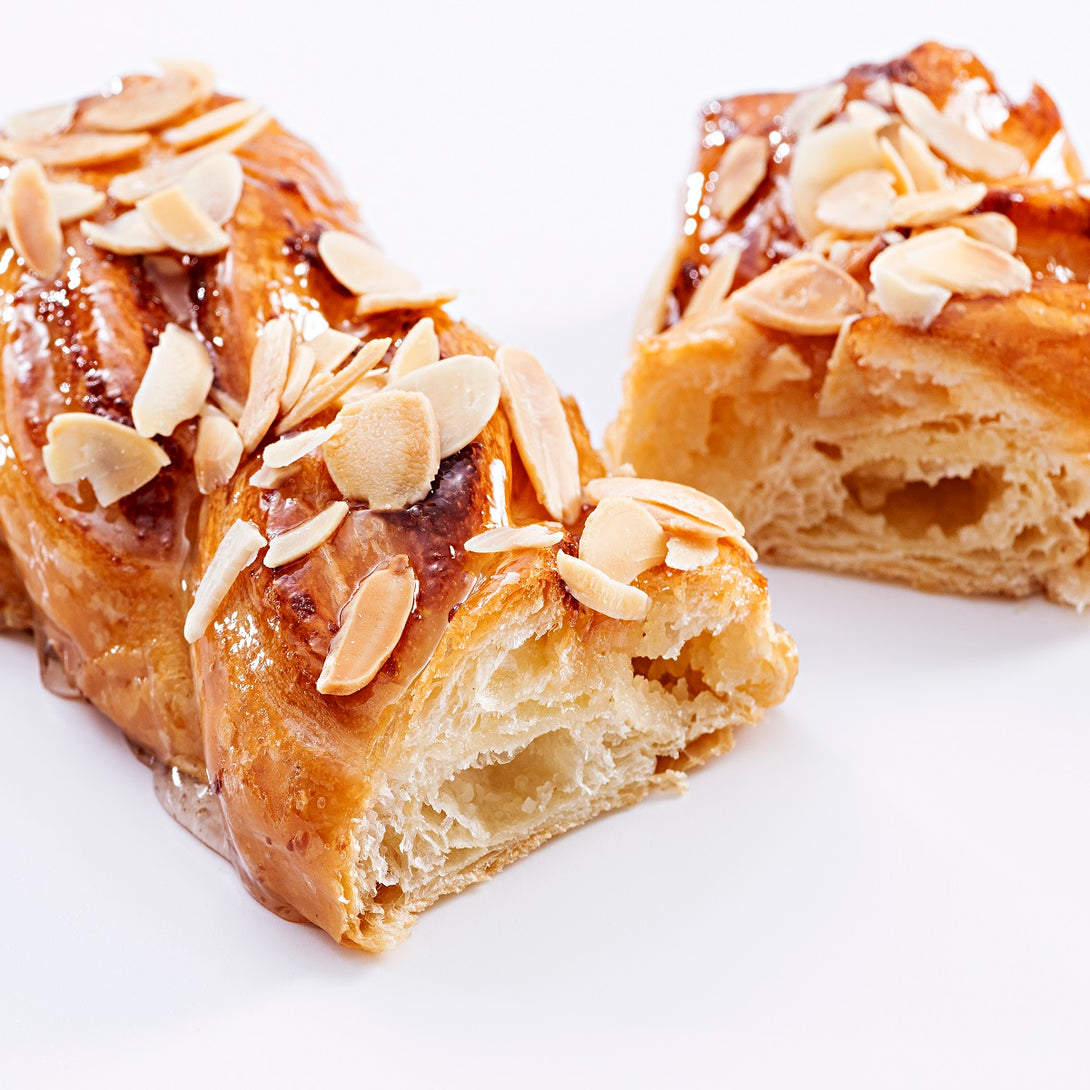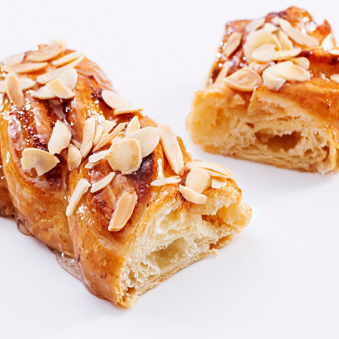 De nuestra colección de minitrenzas. Elaborada con Bollería hojaldrada con mantequilla y con relleno de cremoso de mazapán y crema pastelera. Decorada con almendra fileteada, para la merienda o para un desayuno especial.
