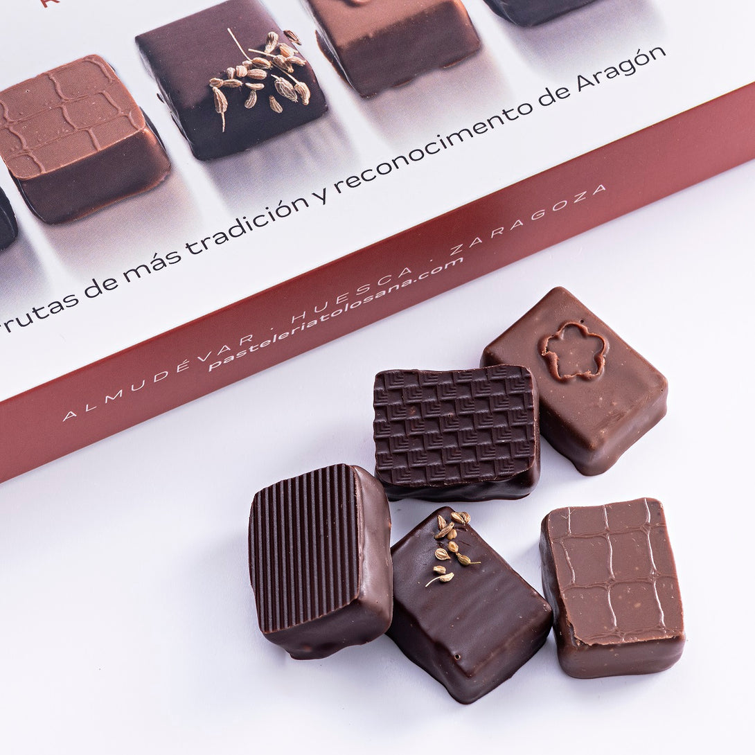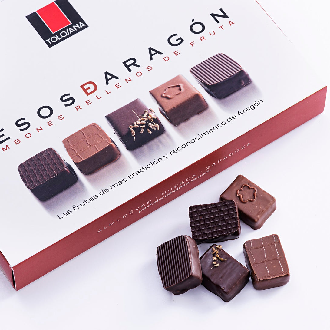 Reinterpretación de las tradicionales Frutas de Aragón con la base de un bombón de praliné de almendra con chocolate combinado con una rica y tierna pasta de fruta. Colección de bombones de praliné con 5 rellenos diferentes de pasa de fruta.