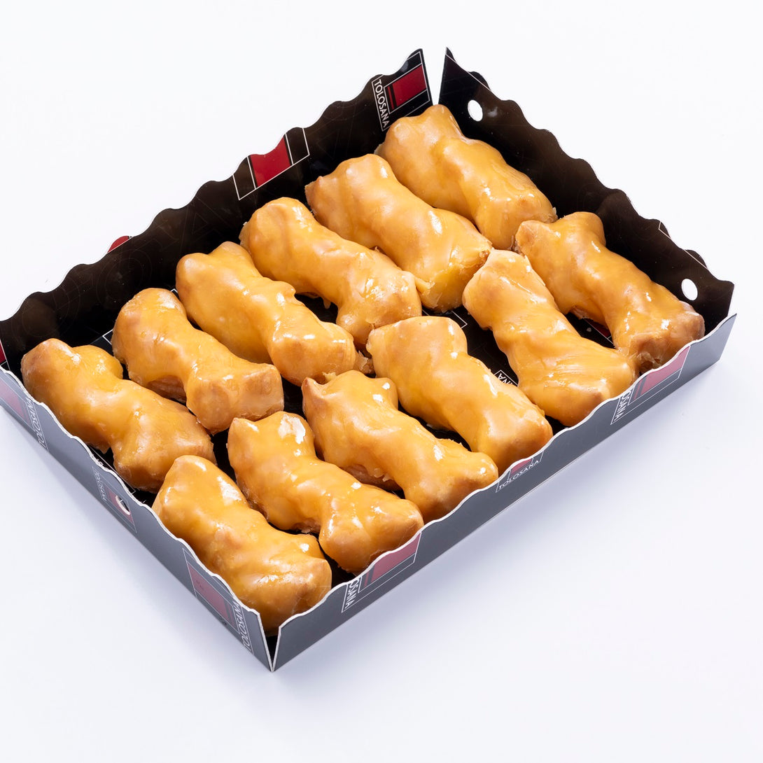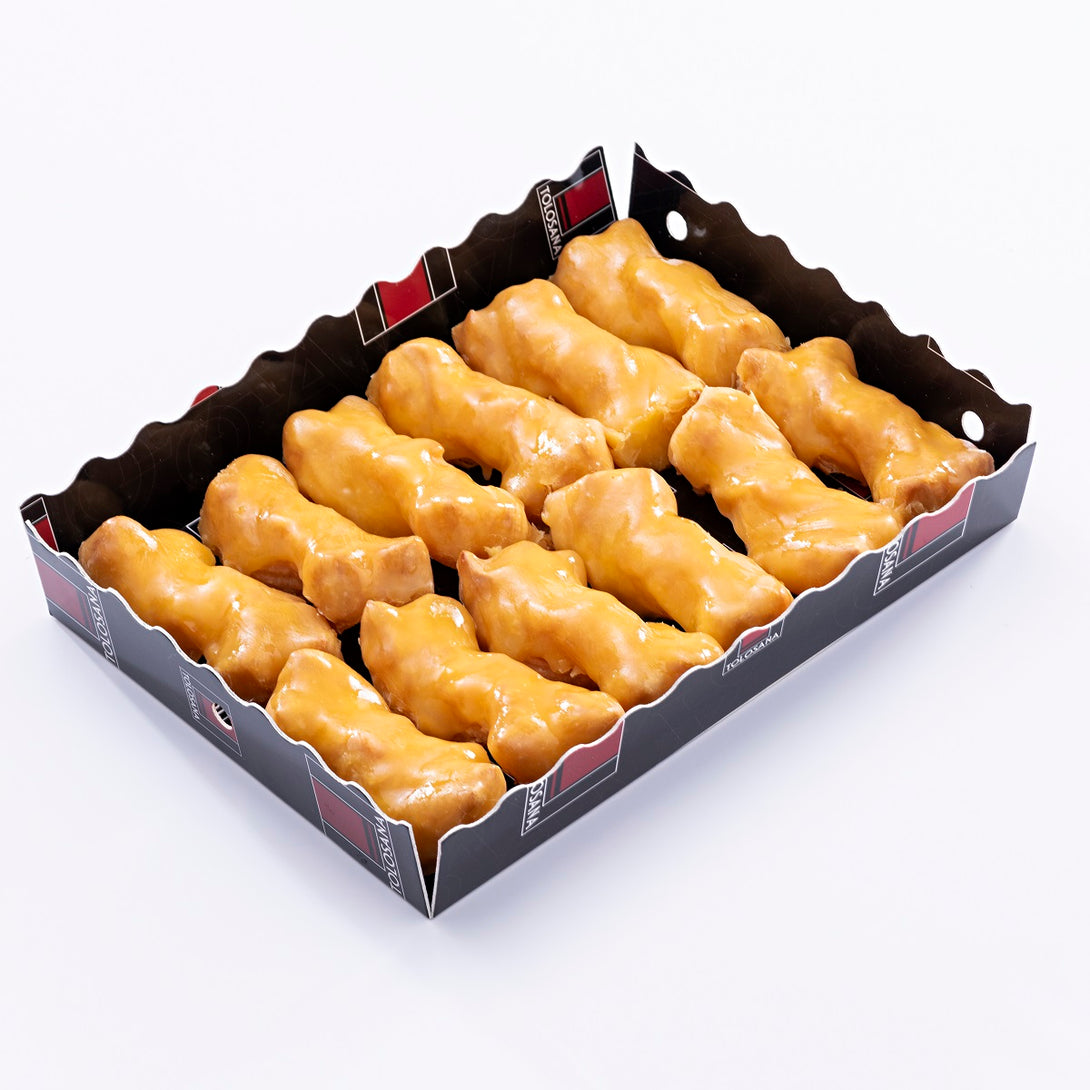 Crujientes y sabrosos lacitos de hojaldre elaborado con mantequilla, y un baño de fina yema pastelera, que luego bañamos con glasa para luego secar al horno y conseguir su aspecto brillante y crujiente.