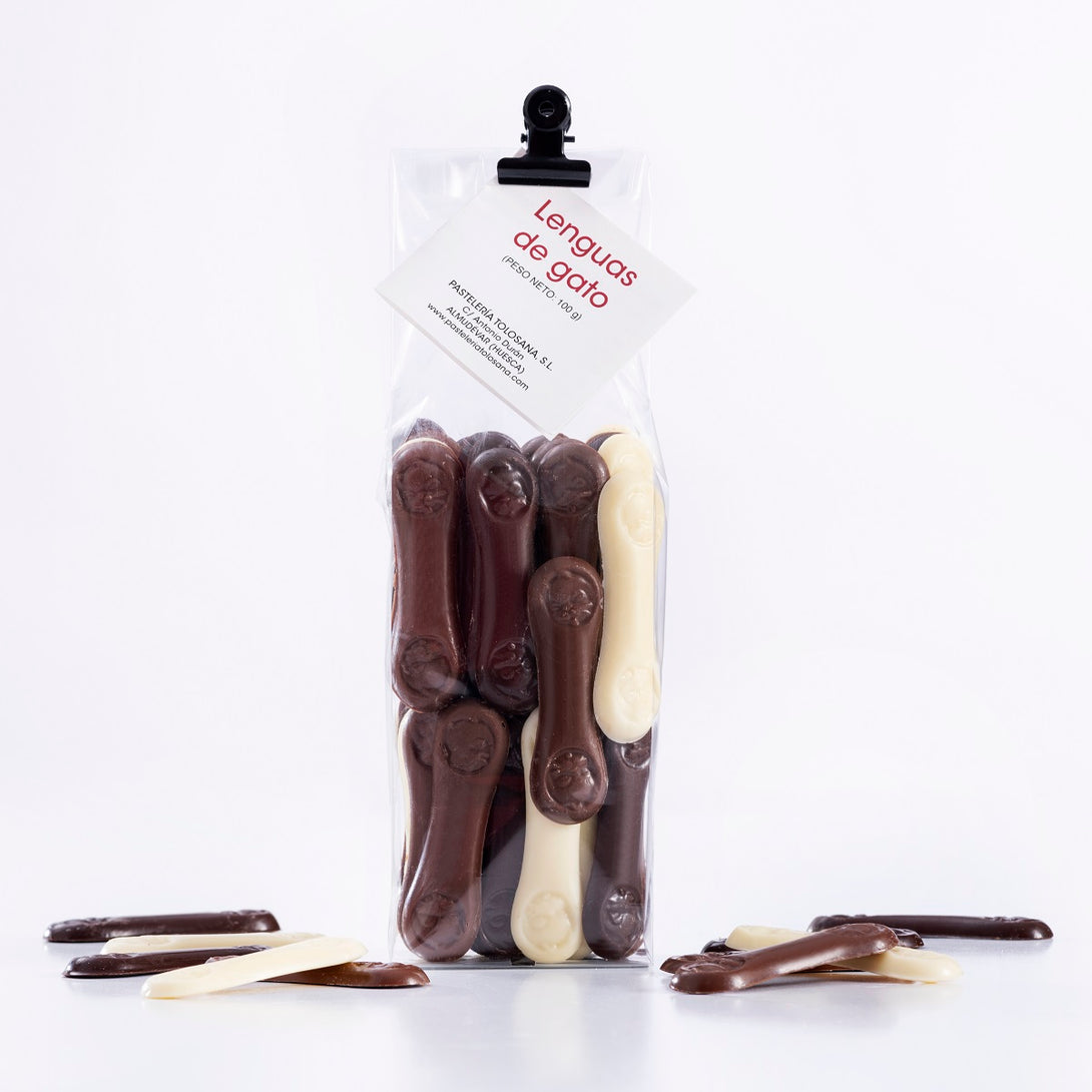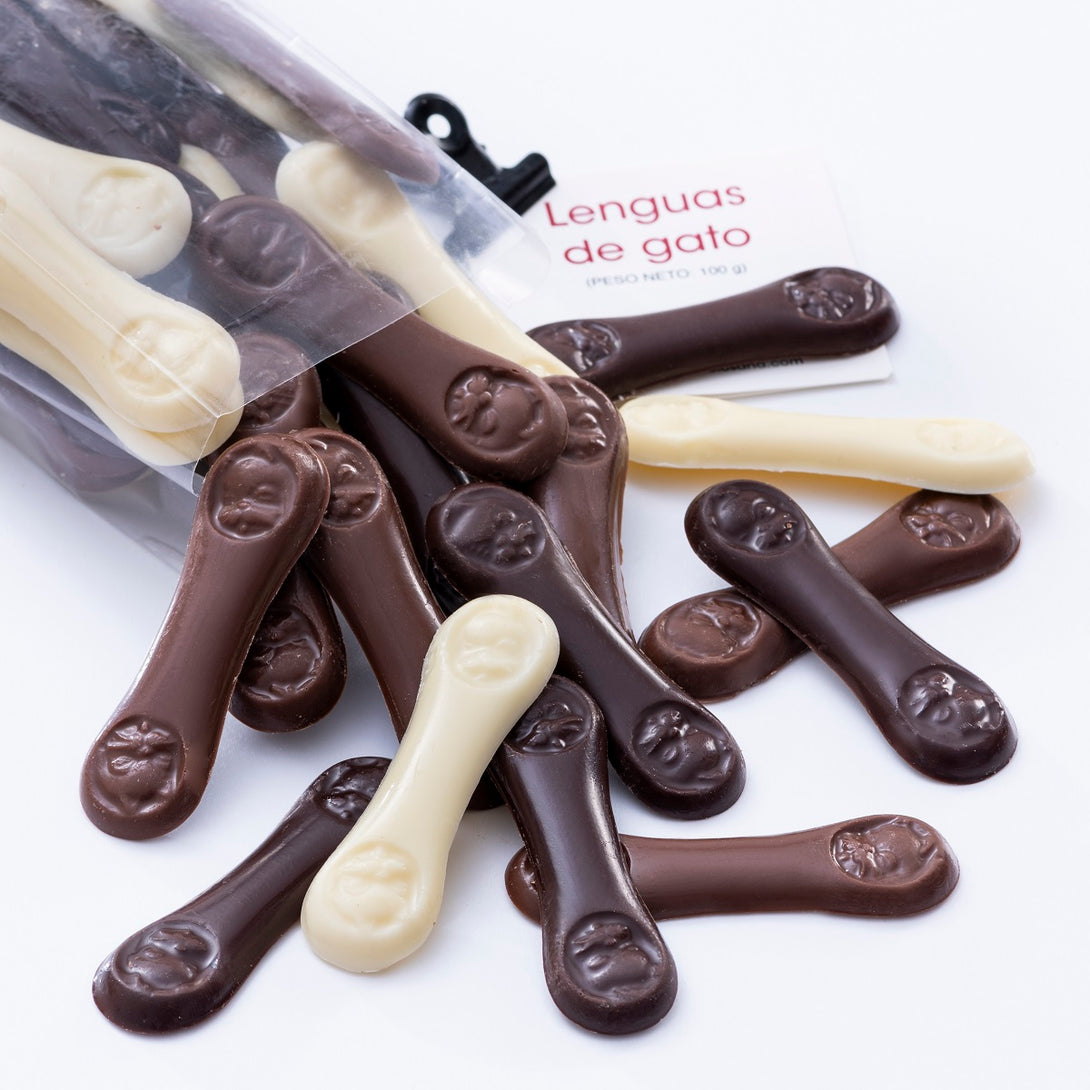Tradicionales lenguas de gato, con tres sabores diferentes: chocolate negro, chocolate con leche y chocolate blanco de  una cobertura de chocolate de gran calidad.