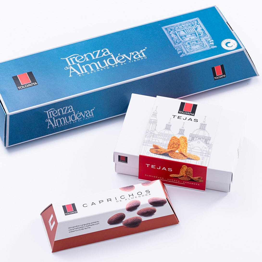 Pack especial para disfrutar de la auténtica Trenza de Almudévar, junto con Tejas y Caprichos de almendra.