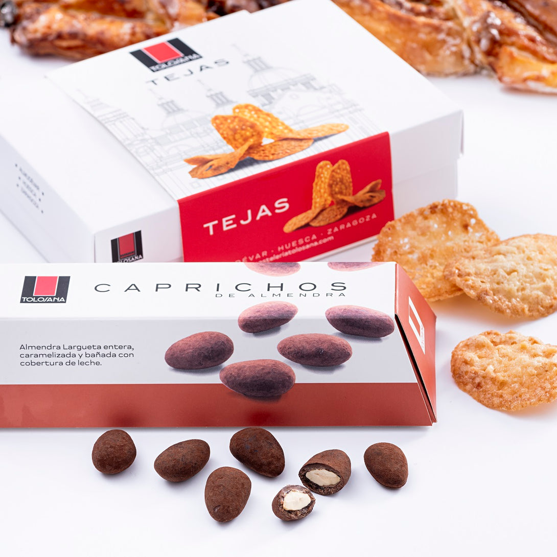 Elige nuestro pack con la selección y combinación de nuestras especialidades más reconocidas. Con un descuento especial por escoger esta opción. Para regalar y sorprende o para disfrutar en tu casa. Pack compuesto nuestra original. Trenza de Almudévar, 1 caja de crujientes, Tejas y de caprichos de almendra con el mejor chocolate.