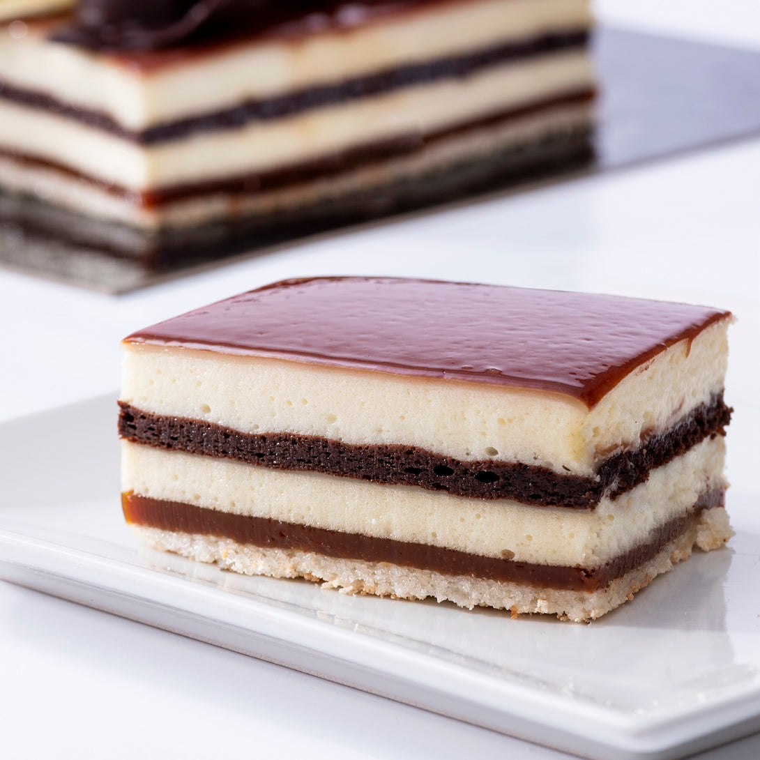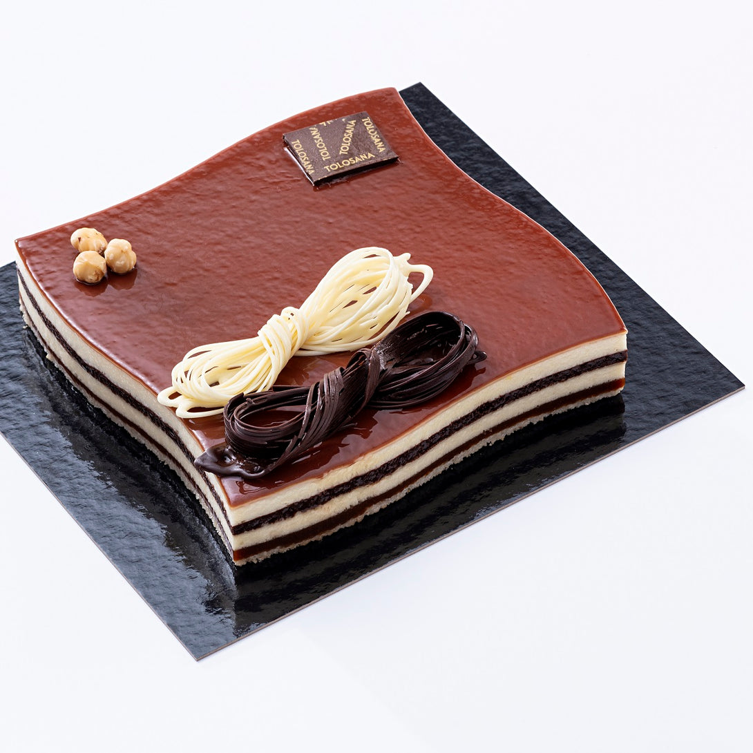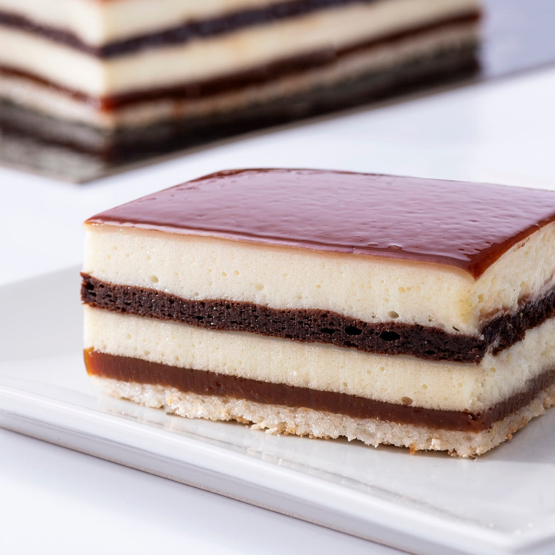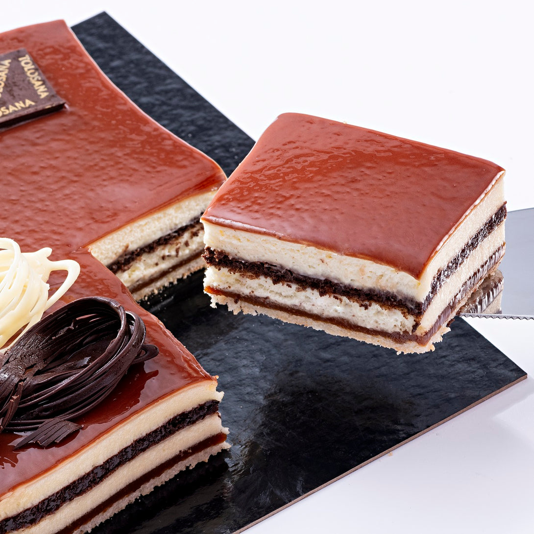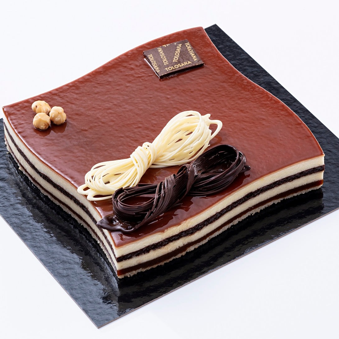 Creación original de Pastelería Tolosana. Delicado pastel con un bizcocho Crujiente de almendra y otro bizcocho tierno de chocolate (sin harina) con un cremoso de praliné de avellana y mousse ligera de chocolate blanco y una cubierta con baño de praliné de almendra. Peso: 80 g