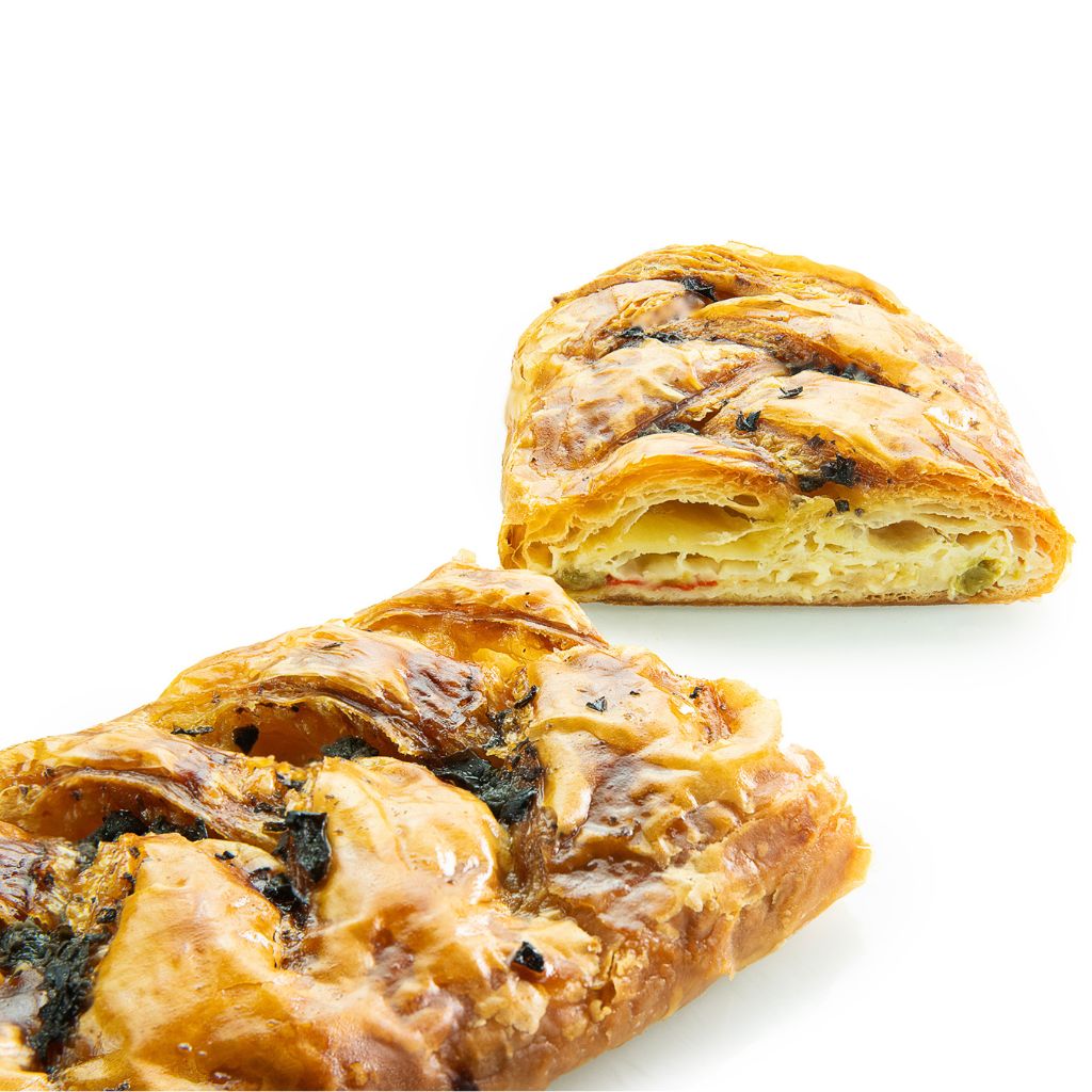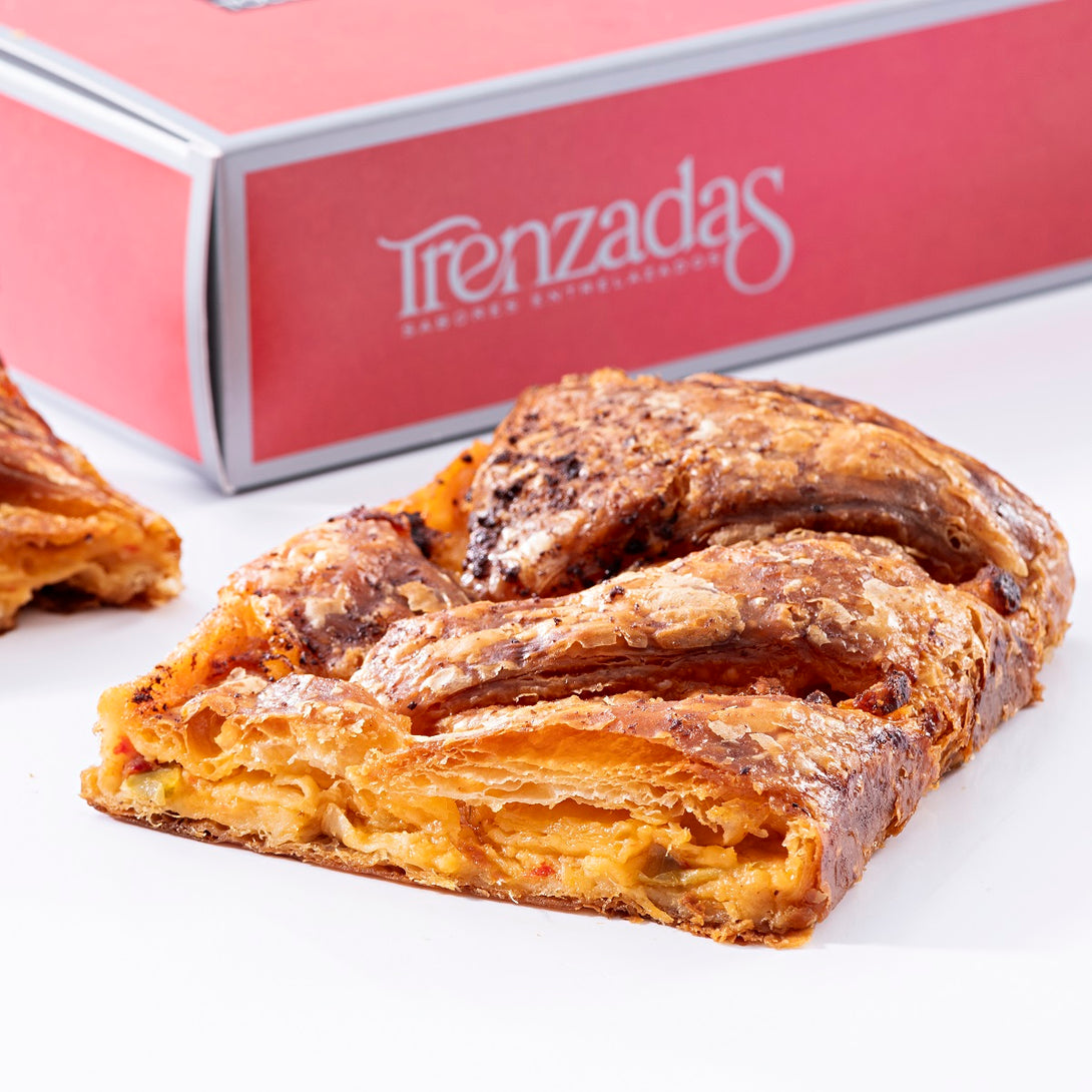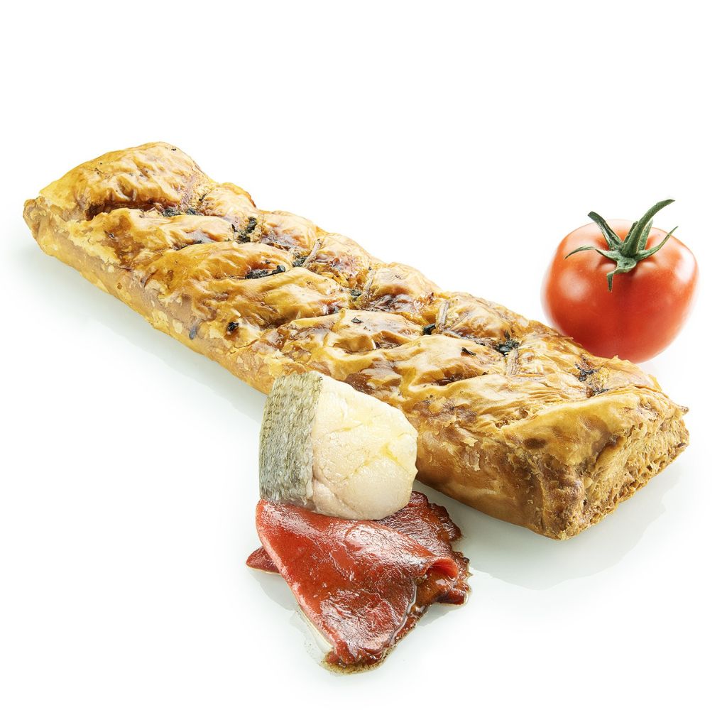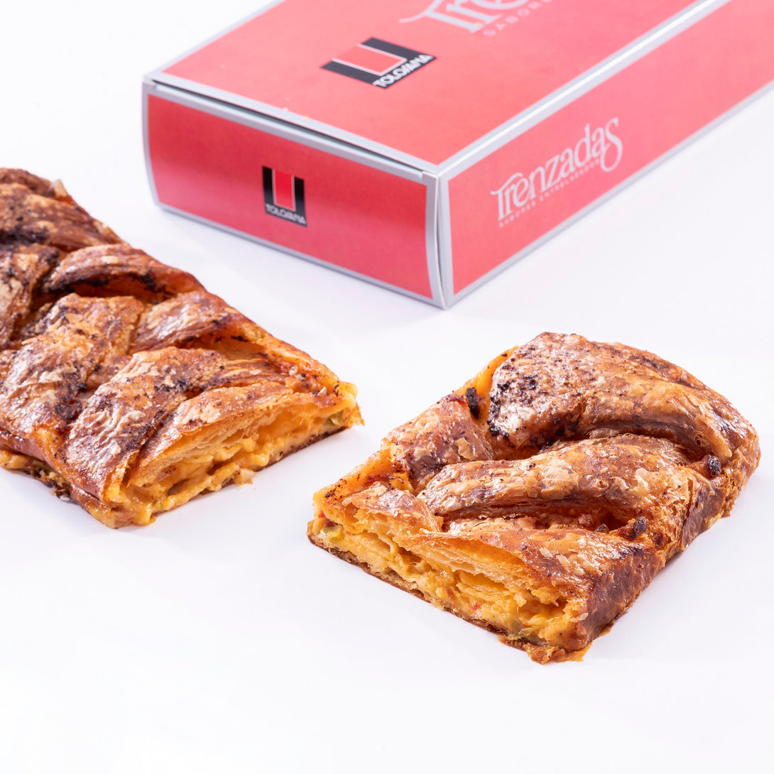 Trenzada salada rellena con una exquisita y delicada brandada elaborada con el mejor bacalao sobre una capa de salsa de tomate y pimientos de piquillo. Un plato de la cocina tradicional que trasladamos a nuestras Trenzas con una nueva interpretación.